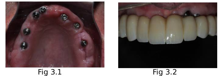 Occlusal view of maxillary implant fixtures (Fig 3.1) and the completed iBAR-supported Illusion Zirconia prosthesis (Fig 3.2).